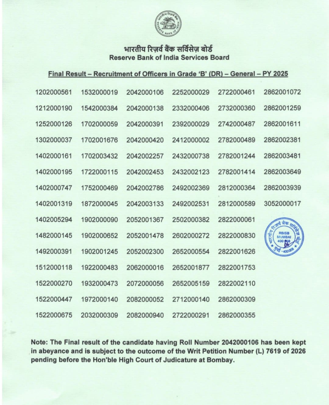 RBI Grade ‘B’ (General) Results 2025
