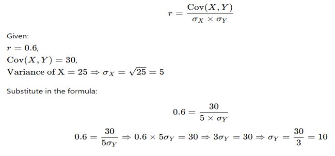 and Y is 0.6 . The covariance between X and Y is 30 . The variance of X is 25 . Find the standard deviation of Y.Solution