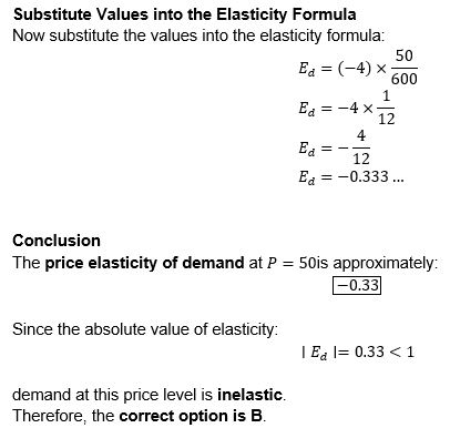 given by: Q = 800 – 4P What is the price elasticity of demand when the market price (P) is 50?Solution
