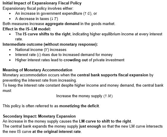 an expansionary fiscal policy and the central bank provides monetary accommodation to prevent a rise in the interest rate, what is the resulting effect on the IS and LM curves?Solution