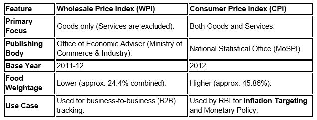 - Stage of Transaction: WPI measures inflation at the producer/wholesaler level (first stage), whereas CPI measures it at the retail level (last stage). Retail prices often lag behind wholesale prices because retailers may temporarily absorb cost increases or because government subsidies/taxes (like excise duty cuts) may cushion the final consumer from the full brunt of a global price hike.