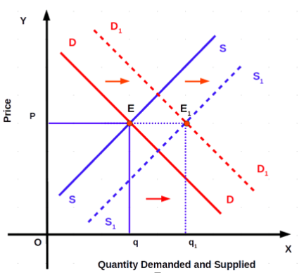 Since both shifts move quantity in the same direction (increase), the Equilibrium Quantity will definitely increase. The increase in demand tries to push the price up, while the increase in supply tries to pull the price down. The final direction of the price depends on which shift is larger. Therefore, the change in price is ambiguous (cannot be determined without more data). In general, if: · Increase in demand > increase in supply, price rises · Increase in demand < increase in supply, price falls · Increase in demand = increase in supply, price stays same