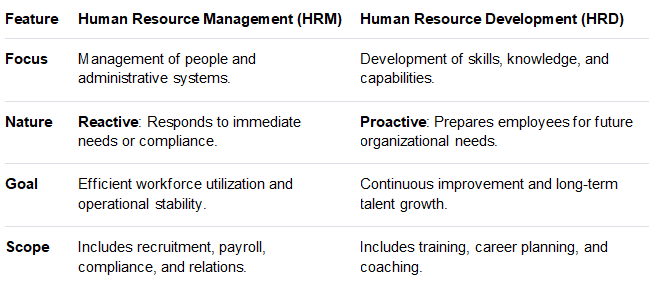 Human Resource Development (HRD) is a proactive philosophy that focuses on the continuous growth, development, and capacity building of employees. Unlike routine personnel administration, which is largely clerical and reactive, HRD views employees as assets to be developed rather than costs to be managed. Designing training programs directly aligns with the HRD goal of improving the knowledge and skills of the workforce to ensure long-term organizational effectiveness. Other options represent core functions of Human Resource Management (HRM). HRM and HRD differ as follows: