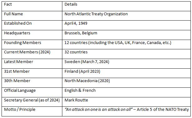 Sweden Joins NATO: • Sweden officially became the 32nd member of NATO on March 7, 2024. • The country applied for membership in 2022, following Russia’s invasion of Ukraine, alongside Finland, citing security concerns in the Baltic region. • Its membership was finalized after the approval of all existing NATO members, with Hungary being the last to ratify Sweden’s accession. Finland’s Entry: • Finland joined earlier on April 4, 2023, becoming NATO’s 31st member. • Both Nordic nations ended their decades-long military non-alignment policies to enhance regional and collective security. North Macedonia’s Entry: • North Macedonia became the 30th member of NATO in March 2020.Static GK: NATO (North Atlantic Treaty Organisation)
