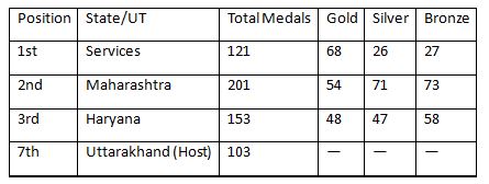 • The 38th National Games 2025 were hosted by Uttarakhand. • The medal tally toppers were: • Note: Maharashtra won 201 total medals but finished second because it had fewer gold medals (54) compared to Services (68 gold). • Best Female Athlete: Dhinidhi Desinghu with 11 medals (9 gold, 1 silver, 1 bronze). • Rugby Winners: Haryana (Men) and Odisha (Women).