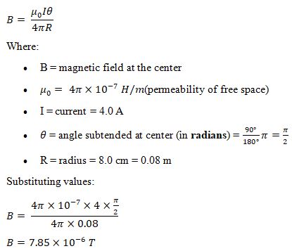 circular arc of radius 8.0 cm. If the arc subtends an angle of 90° at the center, what is the magnitude of the magnetic field produced at the center of the arc?Solution