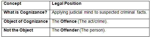 This answer is based on the fundamental legal principle enshrined in Section 223 of the BNSS (which corresponds to Section 190 of the old CrPC). 1. The Statutory Wording (Section 223 BNSS) Section 223 explicitly states: "Subject to the provisions of this Chapter, any Magistrate of the first class... may take cognizance of any offence ..." The section lists the modes by which this cognizance is taken (upon receiving a complaint, a police report, or information from another person). Crucially, the text always refers to the "offence." 2. The Legal Principle: Offence vs. Offender It is a settled position of law (established in landmark judgments like Raghubans Dubey v. State of Bihar, which remains applicable under the new code) that cognizance is taken of the crime, not the criminal.