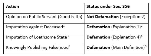 - Exception 2 (Public conduct of public servants): It states that it is not defamation to express in good faith any opinion whatever respecting the conduct of a public servant in the discharge of his public functions, or respecting his character, so far as his character appears in that conduct, and no further.