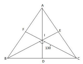 If I is the incentre of ΔABC, then ∠ BIC = 90 0 + ∠ BAC/2 1300 = 90 0 + ∠ BAC /2 1300 - 90 0 = ∠ BAC/2 ∠ BAC/2 = 400 ∠ BAC = 80 0