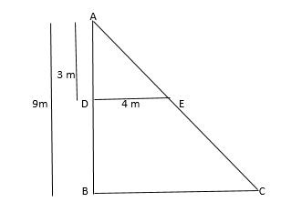 Since, β’s are similar, AD/AB = DE/BC⇒ 3/9 = 4/BC ∴ BC = 12m In β ABC, AC = √(γABγ^2+BC² ) = √(9^2+12² ) = √(81+144) = = √(225 ) = 15 m In β ADE, AE = √(γADγ^2+DE² ) = √(3^2+4² ) = √(9+16) = = √(25 ) = 5 m ∴ CE = AC – AE = 15 – 5 = 10 m