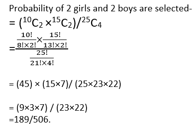 Three students are selected at random. Find the probability that 2 girls and 2 boys are selected. type-sscSolution