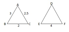 Given that, ΔDEF similar to ΔABC then (AB/BC) = (DE/EF) ⇒ (3/2) = DE/4 DE = 6 cm similarly, (BC/AC) = (EF/DF) ⇒ (2/2.5) = 4/DF then DF = 5 then perimeter of ΔDEF is = DE+EF+DF = 6 + 4 + 5 = 15 cm