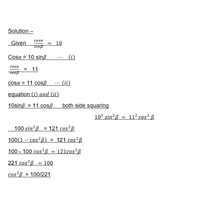 If cosα/sinβ =10 and cosα/cosβ =11 then find the