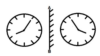 It is clear from left figure that if seen through a mirror the time indicated is 08:05hrs. When the mirror is placed vertically at AB, shows the actual time in the clock i.e., 3:55hrs (right figure).