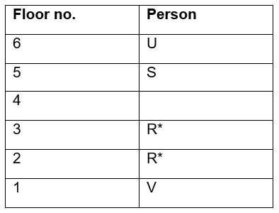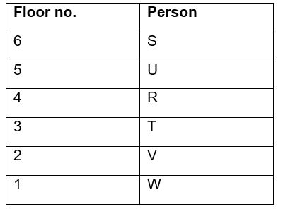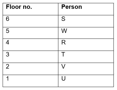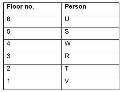 So, from statement I alone, we get either five, no or four persons live below U. From statement II, U lives in an even numbered floor above S. Only three persons live between S and V. S lives above R but not immediately above. We get: