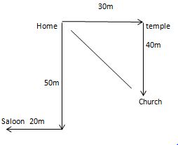 The distance between Temple and the Saloon is as shown Using Pythagoras theorem, we get the distance as 50 m = 70.7 m So the difference is 70.7 – 50 = 20.7 m Hence, option A is correct.