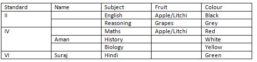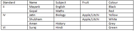 likes? Study the following information carefully and answer the given questions: Aman, Mayank, Gopal, Suraj, Jatin and Shubham are 6 students studying in XYZ School in different standards- II, IV, and VI with atleast one in each. They like different fruits namely- Mango, Guava, Apple, Grapes, Litchi and Blackberry. Each of them has a favourite subject- Hindi, Maths, English, Reasoning, Biology and History not necessarily in the same order. They also like different colours- Red, Green, White, Black, Yellow and Grey. i) Both the students who like Biology and White colour studies in IV standard. ii) The only student studying in VI standard likes Green color and Hindi is his favourite subject, but he does not like Guava. iii) The student whose favourite subject is Reasoning likes Grapes. iv) Amanâs favourite subject is History and he studies in IV standard. v) Mayank studies in II standard. vi) Gopal likes neither Biology nor Apple. vii) Student whose favourite subject is Biology likes Yellow color. viii) Jatin does not like Guava. ix) Surajâs Favourite subject is Hindi. x) Student who likes English does not like Red color. xi) Shubham likes neither Grey nor Yellow color. xii) Neither Mayank nor Shubham likes Maths. xiii) The one who likes Grey color, one who likes Apple and the one who likes Litchi studies in same standard. xiv) There are atleast 2 students in II standard and the one who likes Maths Studies in II standard. xv) The one whose favourite subject is English does not study in same standard with the student whose favourite subject is History.Solution
