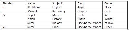 Both the students who like Biology and White colour studies in IV standard .Only Suraj studies in VI standard . He likes Green colour and Hindi is his favourite subject. Student whose favourite subject is Biology likes Yellow Colour. The student who likes Grey colour, One who likes Apple and the one who likes Maths studies in the same standard. Student whose favourite subject is Maths studies in II standard. Student whose favourite subject is English does not study in same standard with the student whose favourite subject is History.(i.e. Student whose favourite subject is English studies in II standard as Student having History studies in IV standard) Mayank studies in II standard but he does not likes Maths. One who likes English does not like Red colour. Shubham neither likes Grey nor yellow colour. If we combine the above statements, we will get 2 possible cases: Case-1 Case-2