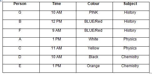 the subject? Study the following information and answer the following questions: A, B, C, D, E, F and G are seven persons who have viva of three different subjects namely Physics, Chemistry, History such that not less than two persons have the viva of same subject. Each person also likes different colour viz. PINK, Orange, Red, Yellow, BLUE, White, Black but not necessarily in the same order. Each of the person's viva held at different times. A likes White and have a viva of Physics with only one other person who likes Yellow. G had a viva with two other persons. There is only one hour gap between the time of the persons who had a viva of Chemistry and the one who likes Yellow. B’s viva was at 12 PM. F’s viva was at 9 AM. Both the persons who had a viva with G like BLUE and Red but not necessarily in the same order. D has a viva of Chemistry with only one person and does not like Orange. The one whose favourite colour is Black had a viva at 10 AM. G’ viva was at 10 AM. The persons whose favourite colour are Black and PINK have viva at the same time. E had a viva with only one person. The one who likes PINK neither have a viva of Physics nor Chemistry. E does not like Yellow. C does not like Red, BLUE or Orange. A and the one whose favourite colour is Orange have their vivas at 1 PM. C had a viva after D.Solution