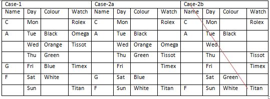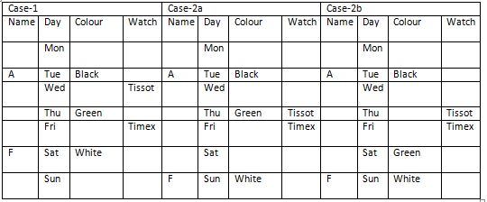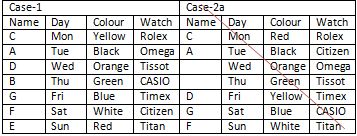 The one, who likes White, goes on any day after Friday, that means we have two possible day for the one who likes White, in case (1) the one who likes White, goes on Saturday, in case (2) the one who likes White, goes on Sunday. There were two days gap between the one, who have Tissot and F who likes White. A likes Black goes  on Tuesday. There were two days gap between A and the one who has Timex. The one, who likes Green, goes on adjacent day of the one who has Timex, that means we have three possible day for the one who likes Green, in case (1) & case (2a) the one who likes Green goes on Thursday, in case (2b) the one who likes Green goes on Saturday. Based on above given information we have: C neither goes on adjacent day of the one has Tissot nor on adjacent day of F. One person likes between the one who likes Orange and C, who has Rolex, that means C goes on Monday. There were three days gap between the one who has Titan and the one who likes Orange. G neither has Titan nor he goes before the one who likes Green and he likes Blue. There were two days gap between G and the one who likes Omega, who goes on adjacent day of the one who has Tissot, that means case (2b) is not valid, in case (1) G likes on Friday, in case (2a) G likes on Saturday. Based on above given information we have: