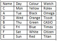 true? Study the following information carefully and answer the questions given below it. Seven persons namely â A, B, C, D, E, F and G likes different colour viz. White, Black, Red, Yellow, Green, Blue and Orange and goes to shopping from Monday to Sunday. Each of them has different watch viz. Rolex, Omega, CASIO, Tissot, Titan, Timex and Citizen. All the above given information is not necessary in same order. There were three days gap between the one who has Titan and the one who likes Orange. The one, who likes White, goes on any day after Friday. There were two days gap between the one, who have Tissot and F who likes White. There were three days gap between D and the one who likes Red. One person goes between the one who likes Orange and C, who has Rolex. The one, who likes Green, goes on adjacent day of the one who has Timex. At least three person goes between the one, who likes Yellow and the one, who has Citizen. There were two days gap between G and the one who likes Omega, who goes on adjacent day of the one who has Tissot. C neither goes on adjacent day of the one has Tissot nor on adjacent day of F. A likes Black and goes on Tuesday. G neither has Titan nor goes before the one who likes Green and he likes Blue. D and the one who has CASIO, goes on adjacent days. Neither D nor B likes Red. There were two days gap between A and the one who has Timex.Solution
