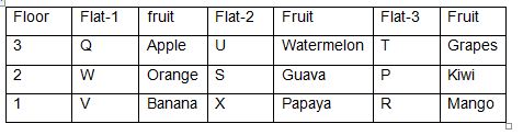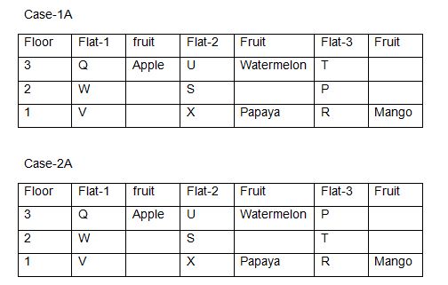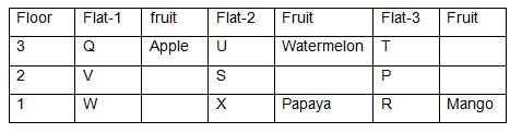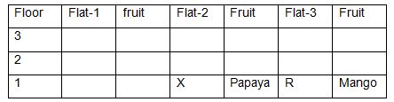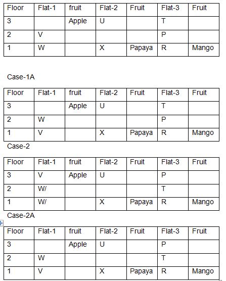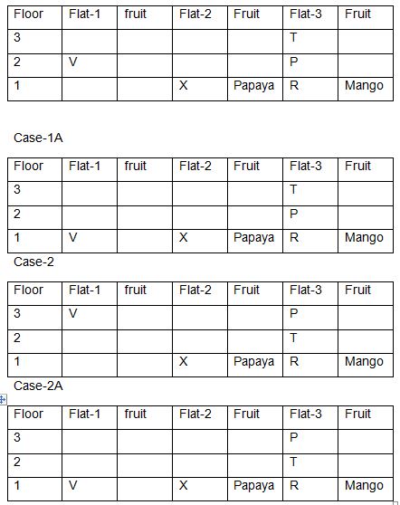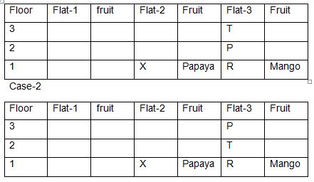 X who likes Papaya lives to the immediate west of R who likes Mango and lives in Flat-3 of Floor-1. T and P lives in the same flat which is Flat-3.Note: Here we get one more case. Case-1