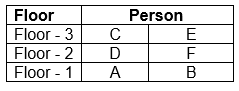 questions. A, B, C, D, E, and F live on a three floored building. The bottommost floor is numbered Floor - 1 and the topmost floor is numbered Floor - 3. A lives with B on a non-prime numbered floor. C lives just above the floor on which D lives. E doesn’t live with D. Who among the following lives with on the second floor?Solution