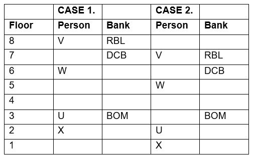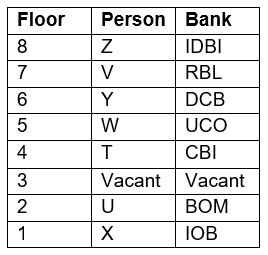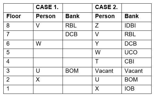 V, who has account in RBL, lives two floors above W’s floor. X’s floor is four floors below W’s floor. U, who has account in BOM, lives on a prime number floor. The one, who has account in DCB, lives four floors above U’s floor. There will be two cases: If W lives at floor no. 6, V lives at floor no. 8. X lives at floor no. 2. If U lives at floor no. 3, then the one, who has account in DCB lives at floor no. 7. If W lives at floor no. 5, V lives at floor no. 7. X lives at floor no. 1. If U lives at floor no. 2, then the one, who has account in DCB lives at floor no. 6. T lives immediately above vacant floor. One person lives between T and the one, who has account in IOB. The one, who has account in UCO, lives immediately above the one, who has account in CBI. Z lives three floors above the one, who has account in UCO. Case 1 will get discarded as we cannot place T. Case 2 . If t lives at floor no. 4, the vacant floor no. is floor no. 3. The X one, who has account in IOB lives at floor no. 1. If the one, who has account in UCO lives at floor no. 5, then the one, who has account in CBI lives at floor no. 4. Z lives at floor no. 8.