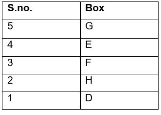 another. The bottommost box is numbered as 1 and the topmost box is numbered as 5. E is kept three boxes above D. G is kept two boxes above F. F is not kept adjacent to D. How many boxes are kept below box H?Solution