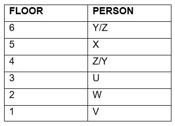 floors of a six-floor building. The bottommost floor is numbered as 1 and the topmost floor is numbered as 6. U lives on 3rd floor. One person lives between U and V. X lives three floors above W. W doesn’t live on 1st floor. How many persons live between Y and Z?Solution