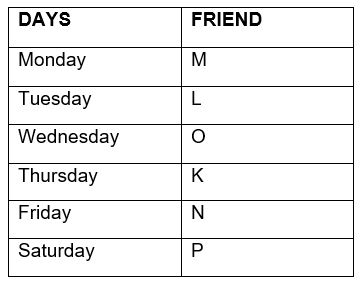 different day starting from Monday to Saturday. Only two friends go after K. Two friends go between L and N. P goes after O but not immediately after O. M goes just before L.N doesn’t go on Saturday. Who goes on Wednesday?Solution