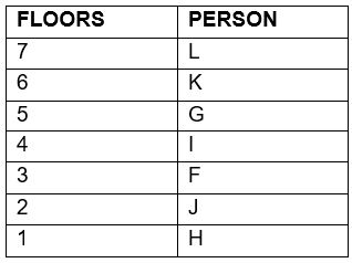 floor of a seven-storey building. The bottommost floor is numbered as 1 and the topmost floor is numbered as 7. F is two floors above H. There are only three floors between L and F. F is below L. Neither G nor J lives immediately above F. K is immediately above G. Who lives on fifth floor?Solution