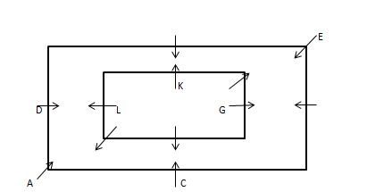 Study the following information and Answer the questions below: In a ground there are 2 benches in rectangle form. One rectangle is inside another. Twelve people went to the ground and sit on the benches i.e on two different rectangles-one inside another. A, B, C, D, E and F are in the outer rectangle facing inward. G, H, I, J, K and L are sitting in the inner rectangle facing outward. They all are sitting in such a way that in each rectangle four persons are sitting in the middle of the sides and two persons are sitting on diagonally opposite corners. Each friend in the inner rectangle is facing another friend of the outer rectangle. A sits on any of the corner. There are exactly two persons sitting between A and E. K sits second to the left of G. D is facing L and B is not opposite C in the outer rectangle. C is on the immediate left of the one who is facing G. Neither K nor G faces either E or A. E is not sitting adjacent to D. H is not facing A. Between H and J there are as many persons as between C and F.Solution